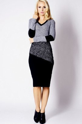 Gaia Wygodna dwukolorowa ołówkowa sukienka z dzianiny czarnej i szarej